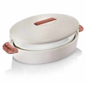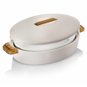ظرف پخت سرامیکی سفید که می تواند برای پخت و پز در فر یا مایکروویو استفاده شود، باید برای حفظ دما، حمل و نقل و سرو روی میز در ظرف حرارتی قرار داده شود.